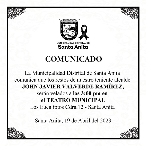 𝐌𝐮𝐧𝐢𝐜𝐢𝐩𝐚𝐥𝐢𝐝𝐚𝐝 𝐃𝐢𝐬𝐭𝐫𝐢𝐭𝐚𝐥 𝐝𝐞 𝐒𝐚𝐧𝐭𝐚 𝐀𝐧𝐢𝐭𝐚, los invita a la despedida de nuestro teniente alcalde John Javier Valverde Ramírez., llevando a cabo hoy a partir de las 3:00 pm. en el Teatro Municipal de Santa Anita.